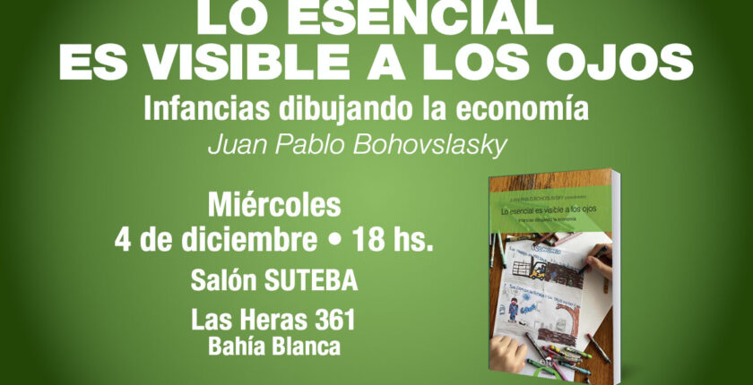 La Casa Salesiana de Educación Superior (Instituto Superior Juan 23 – Universidad Salesiana), el Departamento de Ciencias de la Educación de la UNS y SUTEBA Bahía Blanca invitan a la presentación de “Lo esencial es visible a los ojos. Infancias dibujando la economía”. Se trata de una obra coordinada por Juan Pablo Bohoslavsky que presenta dibujos producidos por niñas y niños de cuarto grado de escuelas primarias de Río Negro en los que expresan lo que saben, sienten y quieren sobre la Economía.